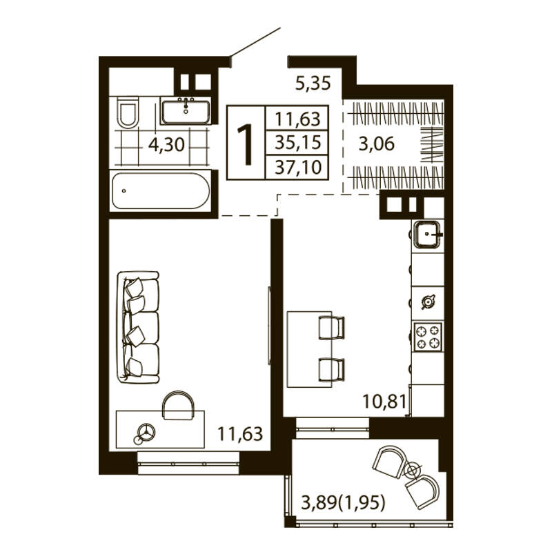 1-комн. квартира 37.1 м²
