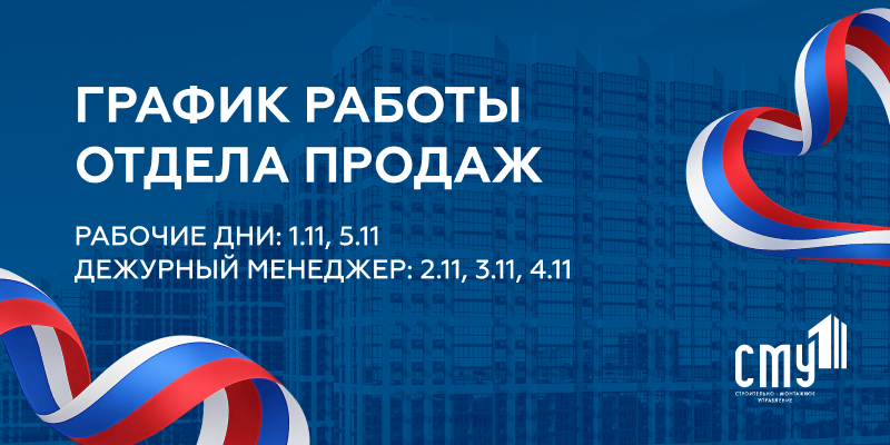 Сообщаем вам о режиме работы отдела продаж СМУ-1 в ноябрьские праздники: